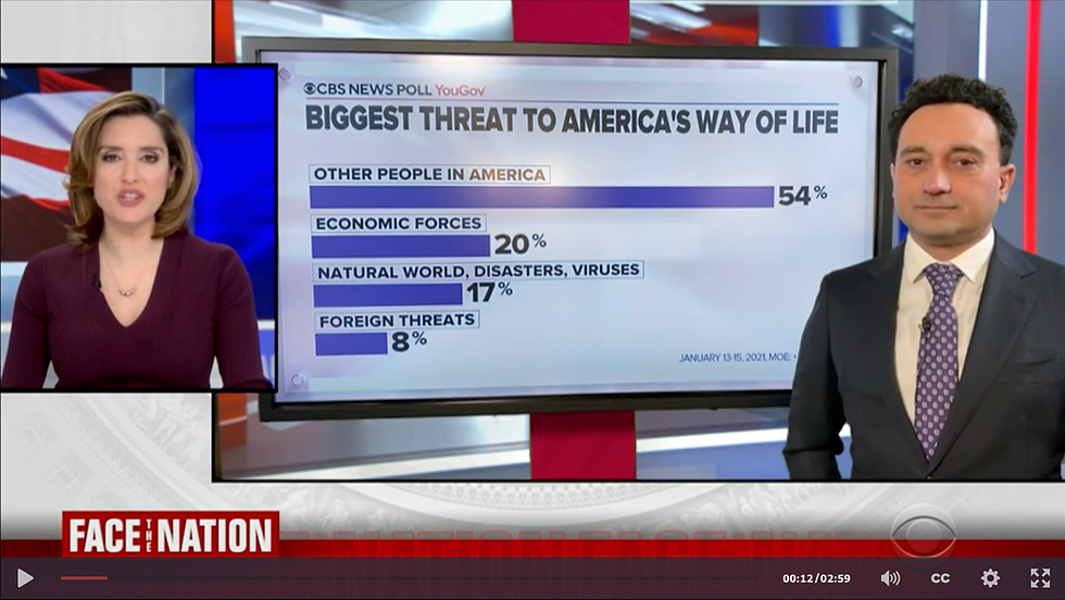 Today the CBS news program, Face the Nation, reported that 54 percent of Americans believe the biggest threat to America's way of life is "Other People in America". That compares to 20 percent who named Economic Forces, 17 percent who cited Natural World, Disasters, Viruses, and 8 percent who were most worried about "foreign threats."